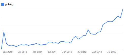 This chart shows the growth of Google searches for the term “golang” over the past four years. Notice the knee in the curve around March 2012, when Go 1.0 was released. If these searches are a decent proxy for interest, then it’s clear that interest in Go has grown remarkably since launch, and particularly so in the last 2 years.