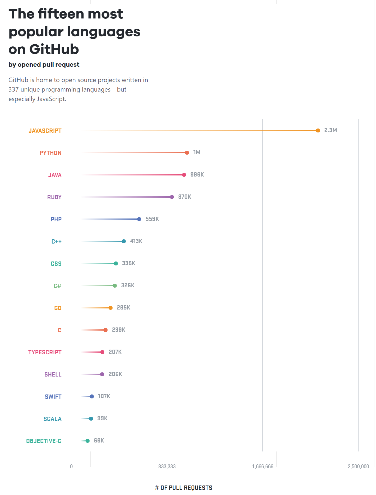 Go has been embraced by developers all over the world with approximately one million users worldwide. In the freshly published 2017 Octoverse by GitHub, Go has become the #9 most popular language, surpassing C. Go is the fastest growing language on GitHub in 2017 in the top 10 with 52% growth over the previous year. In growth, Go swapped places with JavaScript, which fell to the second spot with 44%.