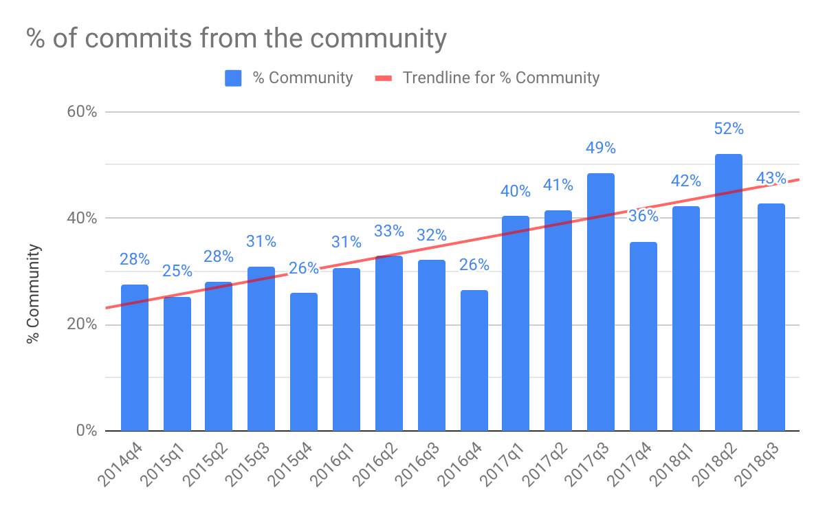 The Go project has been increasing in the number of contributions from the community for several years. The project hit a major milestone in mid-2018 when, for the first time, we had more contributions coming from the community than the Go team.