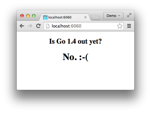 For our demonstration we will use the outyet program from the Go examples repository, a simple web server that reports whether the next version of Go has been released (designed to power sites like isgo1point4.outyet.org). It has no dependencies outside the standard library and requires no additional data files at run time; for a web server, it’s about as simple as it gets.