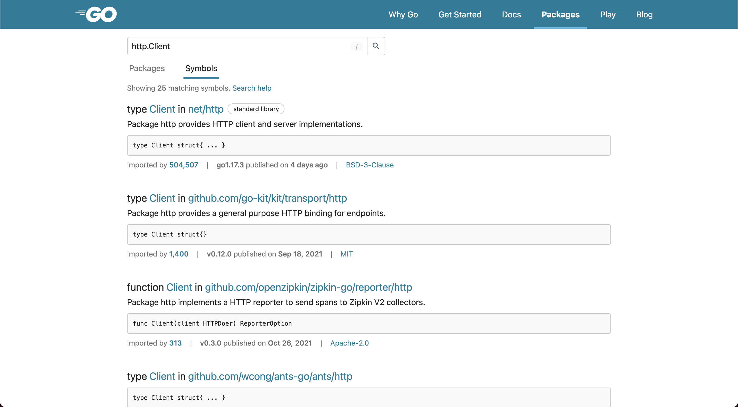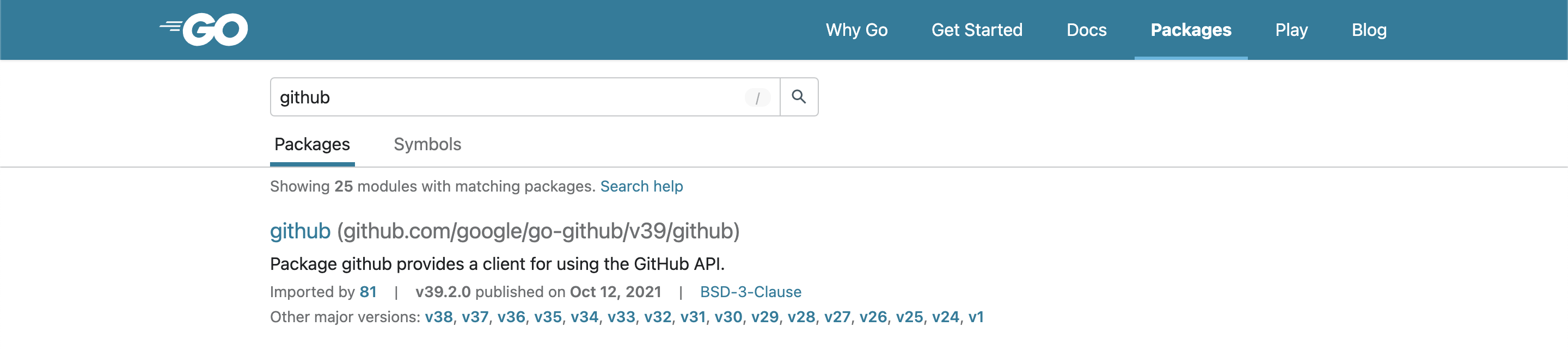With this search update, pkg.go.dev now also supports searching for symbols in Go packages. When a user types a symbol into the search bar, they will be brought to a new search tab for symbol search results. There are a few different ways in which pkg.go.dev identifies that users are searching for a symbol. We’ve added examples to the pkg.go.dev homepage, and detailed instructions to the search help page.