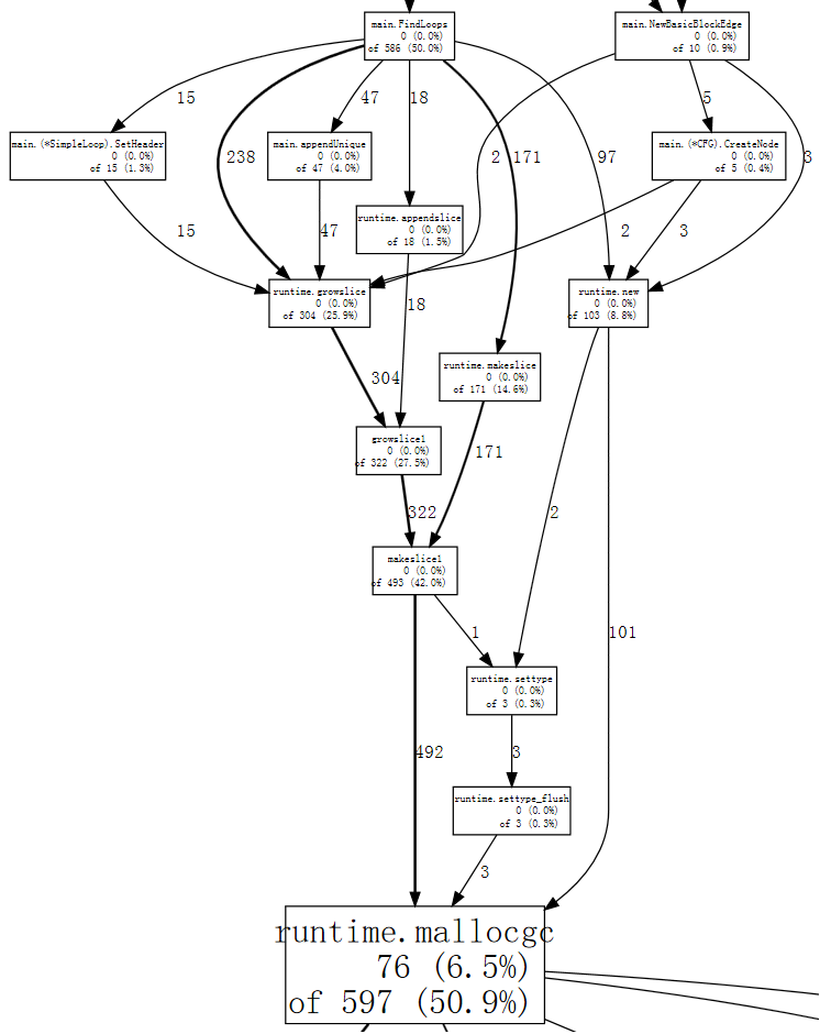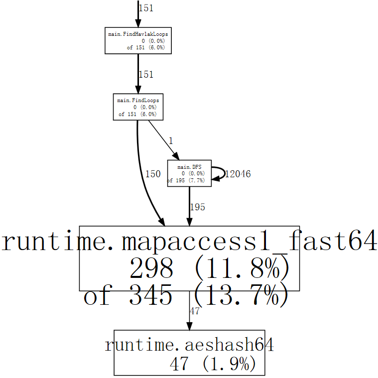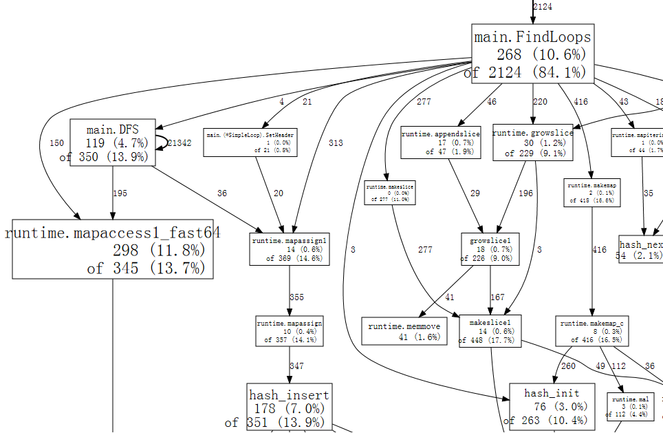 If we squint, we can see that the calls to runtime.mapaccess1_fast64 are being made by main.FindLoops and main.DFS.