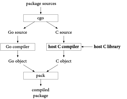 Host C toolchain. Some Go packages, most notably net, default to using cgo on most operating systems. In some cases, such as macOS and Windows, invoking system DLLs using cgo is the only reliable way to resolve host names. When we use cgo, though, we invoke the host C toolchain (meaning a specific C compiler and C library), and different toolchains have different compilation algorithms and library code, producing different outputs. The build graph for a cgo package looks like: